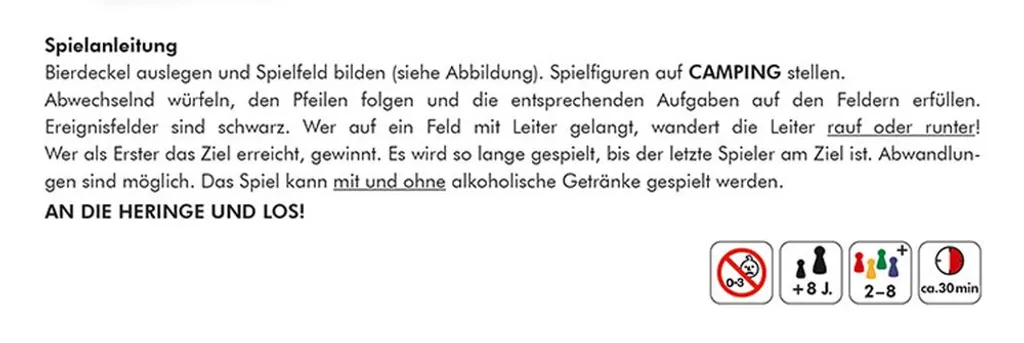 | Zusätzliche Varianten | Gilde 44379 Trinkspiel "Heimatliebe" to go Bierdeckelspiel im Filzetui, Gilde 44381 Trinkspiel "Camping" to go Bierdeckelspiel im Filzetui Reisespiel, Gilde 44382 Trinkspiel "Grill" to go Bierdeckelspiel im Filzetui Grillen |